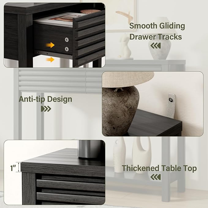 - 【Spacious Storage】This entryway table is designed specifically for storage needs, featuring two spacious drawers that glide smoothly on metal runners for quiet operation. The generous tabletop provides ample space to display decorative items like vases and lamps, while the lower section accommodates shoes, storage bins, or magazines—maximizing entryway storage capacity without compromising on style.