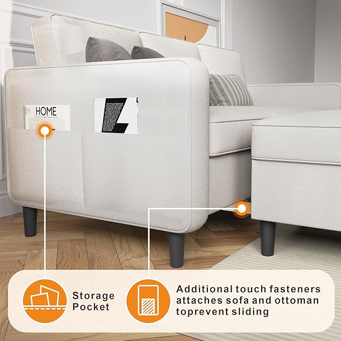 - Convertible and Flexible Couch: This sectional couch with a movable ottoman, you can place square ottoman on left or right of sectional sofa to fit against the wall in your living room. You can use the variability of sofa to change the style of the room at any time.