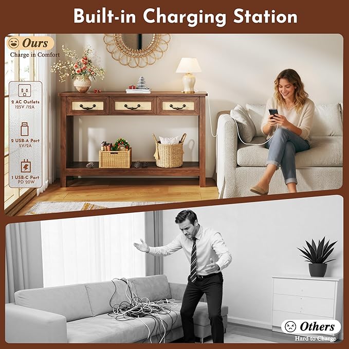 - Modern Charging Console: Crafted with woven rattan and a dark walnut finish, this slim sofa table combines timeless style with modern convenience. The built-in charging station on the tabletop includes 2 AC outlets, 2 USB-A, and 1 USB-C port, keeping your devices powered wherever you place it—behind the sofa, in the foyer, or beside your bed