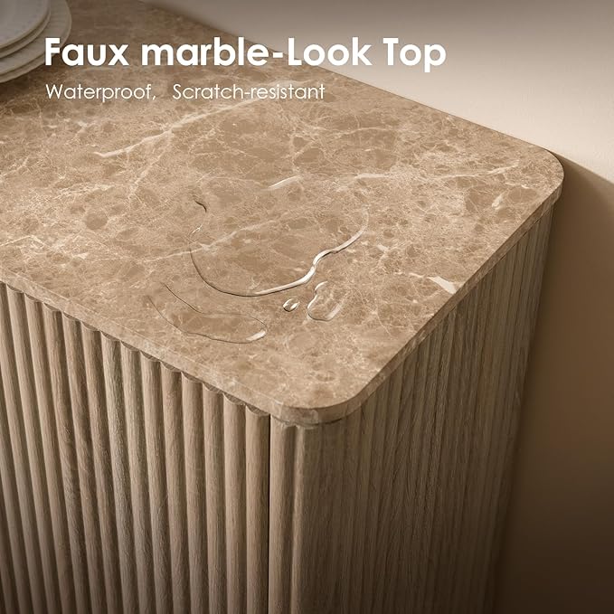 - 【Ample Storage & Durability】- Measuring 34.41"W × 15.63"D × 33.27"H, this 2-door sideboard buffet cabinet with storage offers generous space for dinnerware, pantry items, and daily essentials. The faux-marble top supports up to 150 lbs and features a water- and scratch-resistant surface for easy everyday care. Crafted from FSC-certified engineered wood, it provides reliable strength while using materials that are both durable and environmentally conscious.
