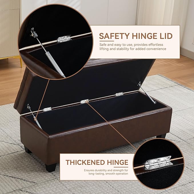 50" Faux Leather Storage Ottoman Bench, Upholstered Rectangle End of Bed Storage Ottoman Tufted Living Room Bedroom Bench with Safety Hinge, Solid Wood Legs, Loads 500 lb(Dark Rrown)