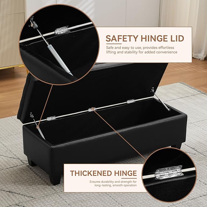 50" Faux Leather Storage Ottoman Bench, Upholstered Rectangle End of Bed Storage Ottoman Tufted Living Room Bedroom Bench with Safety Hinge, Solid Wood Legs, Loads 500 lb(Black)