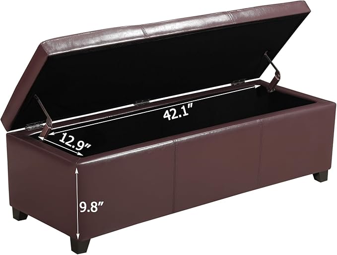 - Versatile Leather Storage Ottoman:Measuring 47" D x 17.1" W x 15.9" H,Your Go-To Storage Solution.This stylish yet sturdy storage ottoman bench combines premium leather craftsmanship with spacious hidden storage to organize any room.The ottoman with storage is perfect for tucking away living room blankets, storing bedroom pillows, or serving as a comfortable entryway seat - all while maintaining a sophisticated look that elevates your space.