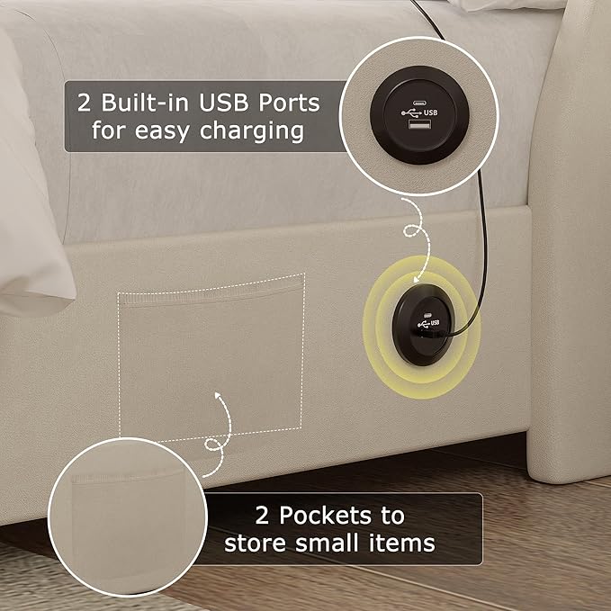 - 【Bed Frame with 2 Charging Ports】 This full bed frame with headboard features built-in charging Ports on both sides, each equipped with a USB port and a Type-C port, allowing you to charge your phone, headphones, and other electronic devices. It can charge up to four devices at once without the need for adapters.