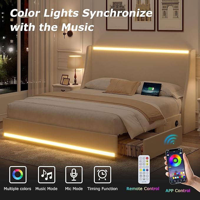 - Material Linen, Metal, Wood : Style Bed Frame with Drawers&LED