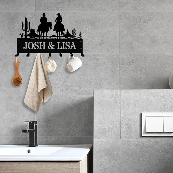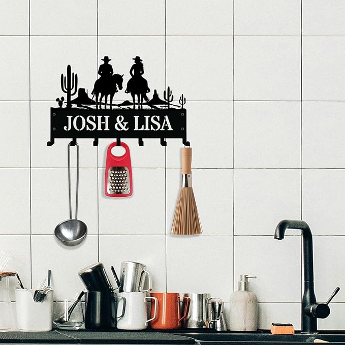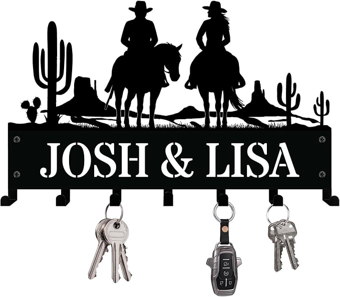 - Personalized Family Key Holder: Customize this wall-mounted key holder with your family name or couple’s name. Featuring a romantic scene of a cowboy and cowgirl riding side by side, this rustic key hanger is perfect for Western lovers, farmhouse-style homes, and proud farmers who embrace country life. A thoughtful and practical gift for newlyweds, anniversaries, or families who love the cowboy lifestyle