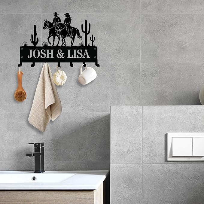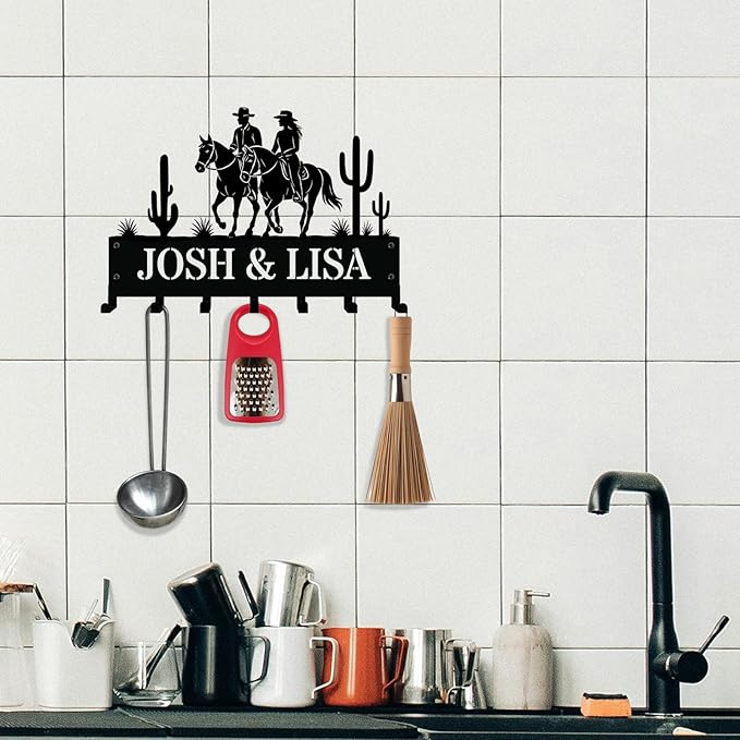 - Personalized Family Key Holder: Customize this wall-mounted key holder with your family name or couple’s name. Featuring a romantic scene of a Western-style couple riding together beneath open skies, this rustic key hanger is perfect for cowboy families, ranch homes, and anyone who embraces the spirit of the American West. A thoughtful and practical gift for newlyweds, anniversaries, or country-loving couples