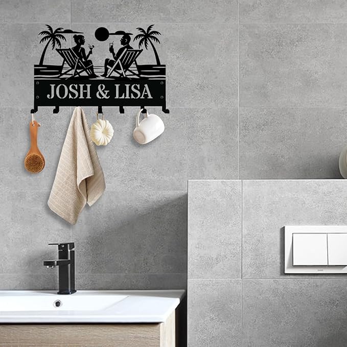 NIWAHO Personalized Beach Couple Key Holder with Name – Custom Metal Wall Mount Keys Hanger Rack with Hooks for Entryway, Front Door, Hallway, Living Room, Kitchen Decor