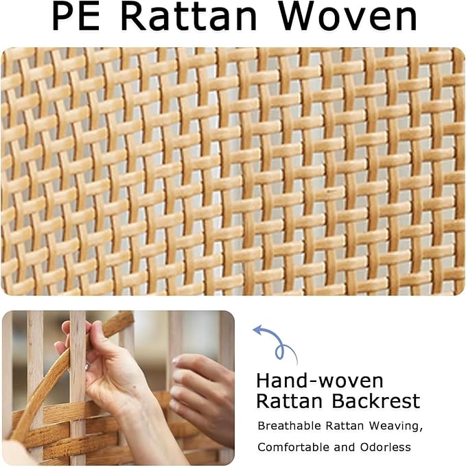 - 【Natural Handwoven Rattan Backrest】Featuring a breathable, lightweight backrest made from handwoven natural rattan, this upholstered dining chairs brings a touch of mid-century charm while offering supportive comfort for everyday dining or lounging