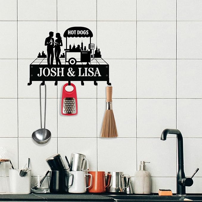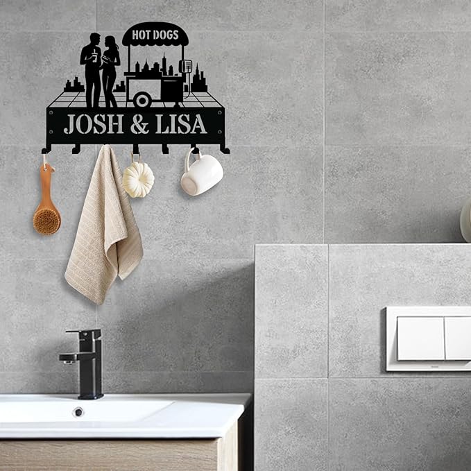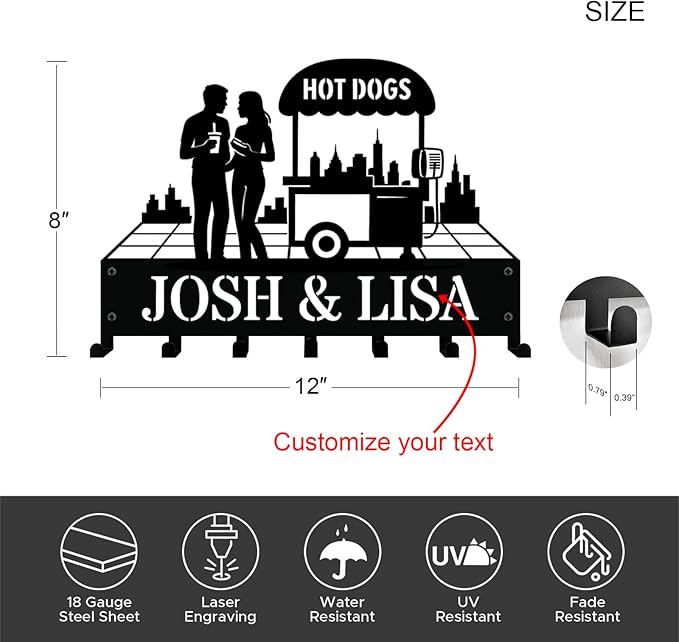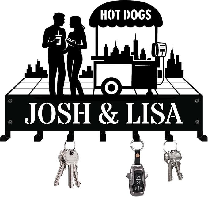 - Urban Couple Key Holder: Personalized wall-mounted key holder with custom family or couple’s name. Features a city couple at a hot dog stand with skyline backdrop. Ideal for modern homes, apartments, or urban-themed decor. Great gift for newlyweds, anniversaries, or city lovers