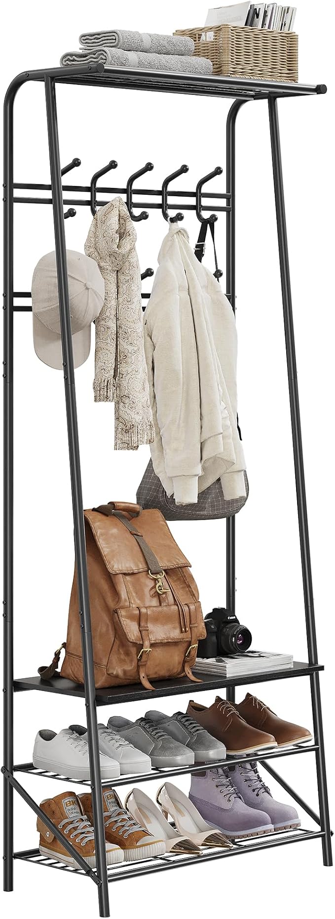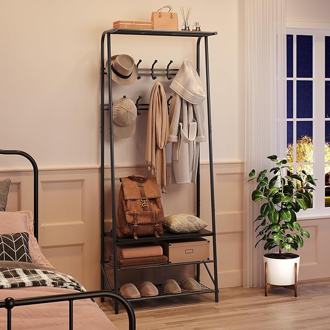 - 【Smart Storage & Organization】 Maximize your vertical space with the strong top shelf for displaying decor or storing bins. Ten rust-proof C-shaped hooks (5 double-sided) offer ample hanging points for coats of all sizes. The bottom open shoe rack keeps your most-worn pairs accessible and air-dried.