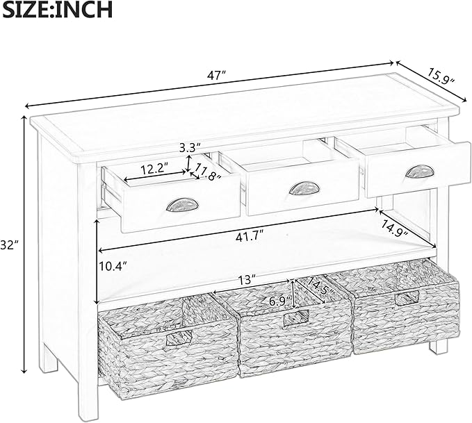 - 【Ample Storage Space】Designed with 3 spacious drawers (22 lbs capacity each) and an open lower shelf (55 lbs capacity), this side board provides plenty of room to organize keys, books, or small essentials. The combination of drawers and baskets creates practical storage for any entryway, hallway, or living room.