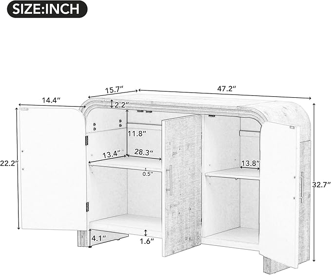 - 【Adjustable Storage Shelves】This buffet table includes 3 doors and 2 large-capacity compartments, each equipped with adjustable shelves. With 3 height options on each side, you can easily customize storage for dishes, cookware, or decorative items to meet your daily needs.