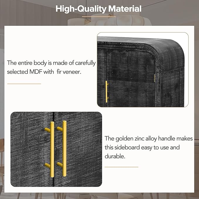 - 【Sturdy MDF Frame & Fir Veneer】Crafted from premium MDF with a natural fir veneer surface, this buffet cabinet ensures durability and stability while displaying a realistic wood grain texture. The golden zinc alloy handles offer long-lasting shine and strength for daily use.