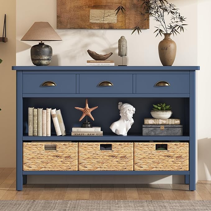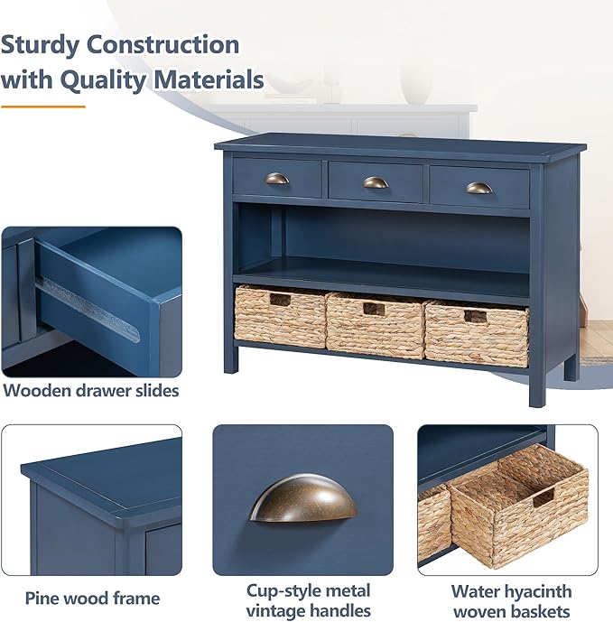 GDFStudio 47" Retro Console Table with 3 Drawers & 3 Water Hyacinth Baskets, Wooden Entryway Buffet Table with Lower Shelf, Vintage Side Board Storage Cabinet for Entryway Hallway Living Room, Navy
