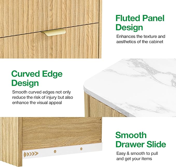 - Modern Chic Design:Elevate your space with this stylish fluted cabinet, showcasing a unique wave-like fluted panel that adds texture and timeless sophistication. The sleek white marble top complements the warm natural oak finish, while smooth curved edges enhance elegance and ensure child-friendly safety.