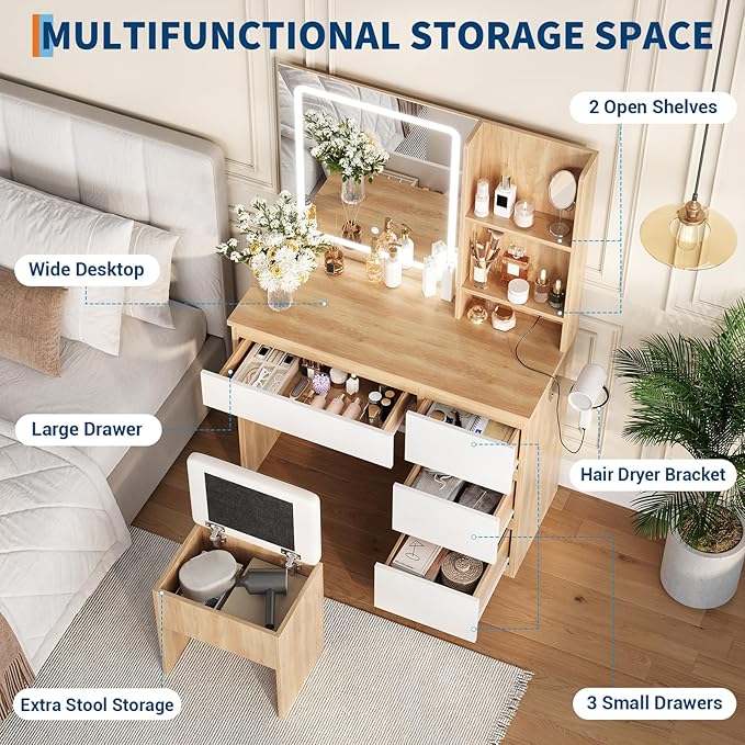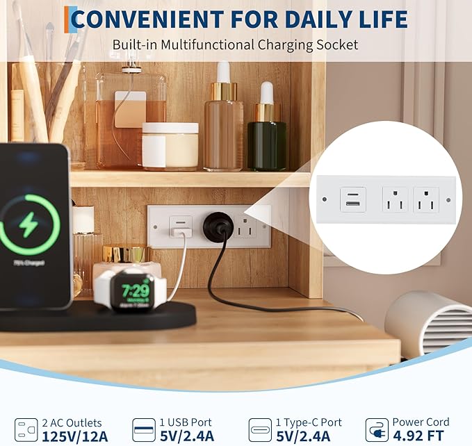 - 【Smart Charging Station & Storage System】Power up styling tools using built-in outlets (2AC+USB+Type-C) with 4.9 ft cord, while the desk with drawers organizes essentials: 1 large drawer holds palettes, 3 small drawers sort brushes, and 2 open shelves display perfumes. A vanity with lights desk designed for organization enthusiasts.