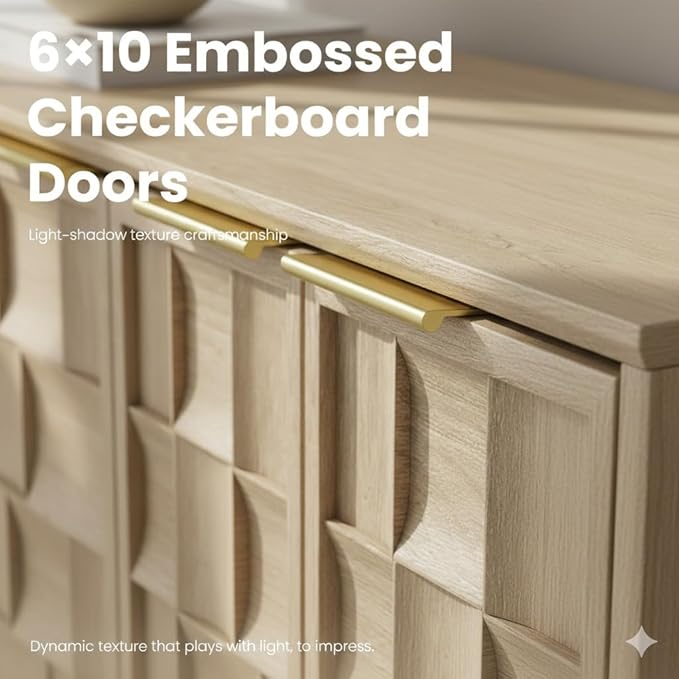 Mid-Century Sideboard Buffet Cabinet with 6×10 Embossed Checkerboard Doors, Adjustable Shelves & Soft-Close Hinges, Modern Storage Cabinet for Dining Room, Living Room, Entryway – Oak White Finish