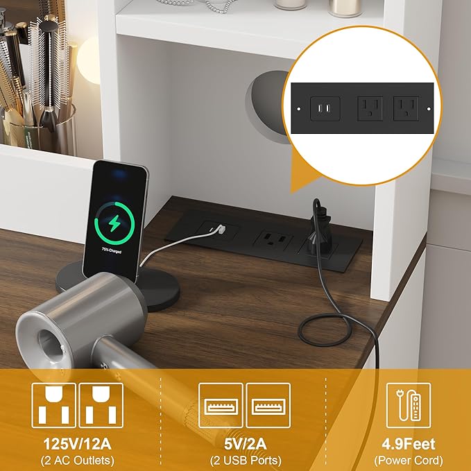 - Built-In Charging Station: Equipped with 2 AC outlets and 2 USB ports, this white makeup vanity set lets you charge phones, tablets, or power hair dryers and curling irons directly at your dressing table for convenient, salon-like grooming at home.