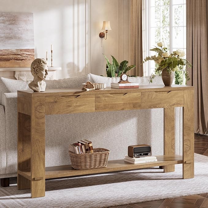 - š š®š§ššš¢šØš§šš„ šššØš«šš š ššØš„š®šš¢šØš§: This long console table boasts a spacious tabletop and 3 large drawers, providing ample space for lamps, photos, or decor. The open bottom shelf is perfect for organizing larger baskets, making clutter a thing of the past